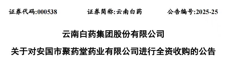 云南白药加速布局全国中药饮片市场,拟斥资6.6亿元收购头部饮片企业,且对方向云南白药承诺未来三年净利润目标。 01 拟6.6亿元收购聚药堂 8月15日,云南白药集团股份有限公司(以下简称“云南白药”)发布公告称,其全资子公司云南白药集团中药资源有限公司将以现金方式收购安国市聚药堂药业有限公司(以下简称“聚药堂”) 100%股权,股权转让对价总额为6.6亿元。 云南白药称,此举一方面是响应云南省人民政府提出的高质量发展云南省中药材产业要求,另一方面出于公司自身战略发展目标考虑。 2025年1月,云南白药发布《2024—2028战略规划》中提到,以内生与并购并重的发展方式推进相应业务,积极探索通过战略并购、战略合作等模式,对现有产业板块进行补全、补强。 针对拓展的产业板块,云南白药在4月召开的投资者调研会上透露,重点围绕中药全产业链相关企业开展投资工作,包括中药材种植业、中药饮片与配方颗粒以及中成药企业。 此次拟收购的聚药堂是一家专注于中药饮片、毒性中药饮片、直接口服中药饮片及配方颗粒生产销售的企业。 值得关注的是,聚药堂现股东同意对自2025年1月1日起-2027年12月31日止期间,所实现的经审计的净利润金额及主营业务收入金额进行承诺,详情如下: 如未实现承诺的净利润或主营业务收入金额 ,聚药堂将对云南白药中药资源公司进行补偿。 有网友认为,聚药堂市值在4亿左右,云南白药拟以6.6亿元收购,反映出其对聚药堂的重视和发展前景具备信心。 2024年,云南白药营业收入400.33亿元,实现归母净利润47.49亿元。 云南白药的核心产品——气雾剂、创可贴、散剂及牙膏,在各自细分市场中均占据第一的领先地位,其中前两款产品2024年市场份额分别高达91.8%、72.4%。 据了解,聚药堂的销售模式是通过其自研APP,面向药店、诊所、中医馆等B端客户开展线上业务。平台注册用户达10万家,累计交易客户5.3万家,且主要以“先款后货”的模式运营。其销售区域以北方为主,与云南白药现有市场形成区域互补。 02 除云南白药实现了在战略大品种中药材从种苗选育、药材种植到生产加工的全程、 全产业链闭环外,赛柏蓝发现,近两年九州通、华润医药、国药、广药等医药巨头也在密集布局中药产业上游,加速中药全产业链条闭环。 九州通:2025年,在中药产业上游至少布局10家公司,涉及中药材基地建设、中药材购销、中药饮片代煎等业务; 华润:今年3月华润医药商业与浙江震元合资成立华润