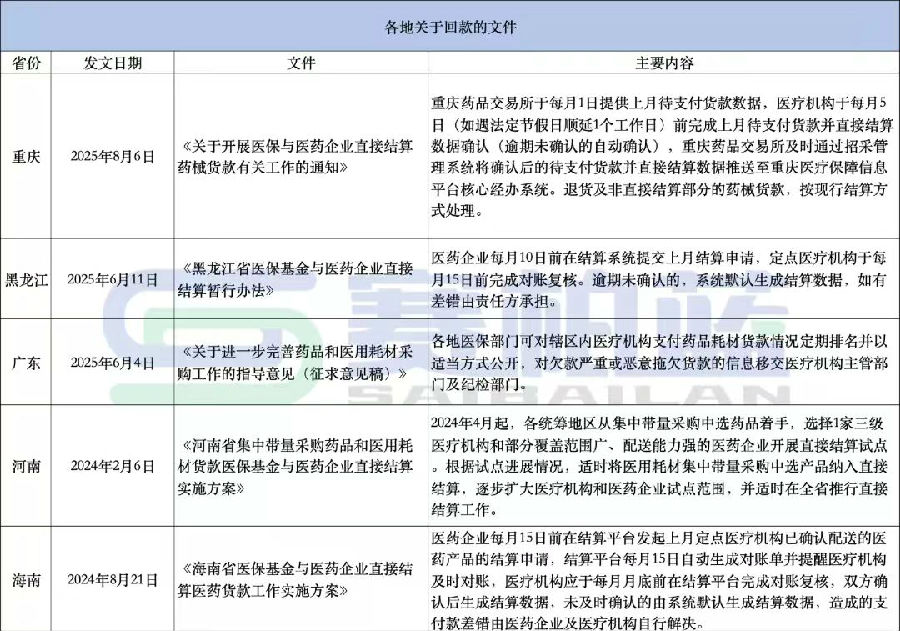 集采药品耗材、国谈药回款难问题,全部破解时间将至。 01 医保直接结算推进提速 集采内回款效率迎来突破 根据国家医保局要求,2025年全国基本实现集采药品耗材、国谈药的直接结算,2026年全国全面实现集采药品耗材、国谈药的直接结算。 当前已进入8月末,距离 “全国全面实现集采药品耗材、国谈药直接结算” 的最终目标时限已进入关键冲刺阶段,各项配套工作推进节奏明显加快。 近日,2025年全国医疗保障工作年中座谈会在陕西召开,会议要求,逐步扩大医保基金对医药机构即时结算范围。 从阶段性成效来看,截至6月底,全国超90%的统筹地区实现即时结算,拨付时限压缩至申报后20个工作日内。与此同时,医保基金对医药集采企业直接结算推进同样成效显著,平均结算周期压缩至30天以内。 据赛柏蓝观察,截至目前,全国已有多个省份及统筹地区率先响应国家要求,发布了针对医保与医药企业直接结算的地方性实施细则或推进方案。 8月27日,重庆市医保局发布《关于开展医保与医药企业直接结算药械货款有关工作的通知》的政策解读,重庆药品交易所每月1日提供上月待支付货款数据,医疗机构于每月5日前完成上月待支付货款并直接结算数据确认。这一政策自9月15日起执行。 8月26日,天津市医药采购中心发布《关于药品、医用耗材集采中选品种2025年第8期直接结算》的通知,要求医保定点医药机构在8月27日-8月30日24:00完成本期待结算明细表网上确认;8月31日—9月3日12:00,经营企业完成本期待结算明细表网上确认。 从地方反馈的实效来看,不少省份已明确体现出回款速度加快的积极变化。 例如,自5月以来,浙江省药械采购平台设置集采品种和国谈药品结算专区,至6月30日,1182家医保定点机构完成结算金额近58亿元,按时结算率99.90%,其中1136家实现100%按时结算;江苏盐城市第一人民医院自今年1月以来,开展医保基金即时结算改革试点,医保基金结算缩短到一个工作日,日均现金流增加200万元,到目前已累计拨付1.5亿元。 不过,行业反馈呈现明显差异化特征,集采内药品回款改善显著,但集采之外的普通药品仍陷“回款难、回款慢” 困境。 黑龙江一医药商业企业人士向赛柏蓝表示,相较于一年前,其手上集采药品的回款已基本追回,“主要是政策压力传导到位,且集采药品本身货款规模相对可控,因此回款速度明显加快”,但该人士同时指出,集采范围之外的普通药品,回款难、回款慢的压力依然较大,成为当前结算改革尚未完全覆盖的领域。 02 集采外药品回款难仍是长期痛点 多因素叠加影响回款周期 事实上,药品回款难一直是行业长期存在的核心痛点。从医院的资金压力、医保结算的滞后性到流通环节的层层垫付以及企业自身的管理问题多重因素叠加下,回款周期不断拉长。 集采之外药品的回款不适用集采的 “统一回款周期”,而是由参与方通过合同约定,医院或商业公司未按合同约定时间付款,药品入库数量、破损理赔、发票问题导致付款金额与约定不符以及药品配送延迟、质量问题与回款挂钩等问题均会影响回款进度。