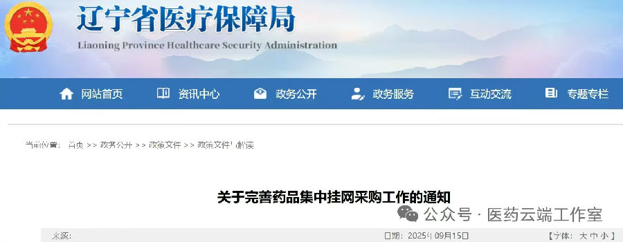 9月15日,辽宁省医保局发布《关于完善药品集中挂网采购工作的通知》(辽医保规〔2025〕4号),自2025年10月1日起实施。原辽宁省有关药品集中挂网采购规定与本通知不一致的,以本通知为准。
