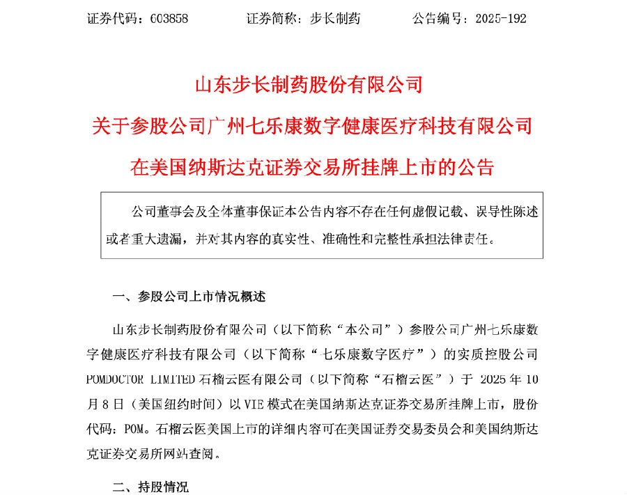 10月14日,山东步长制药发布公告同步这一喜讯,步长参股公司七乐康数字医疗实质控股公司石榴云医10月8日(纽约时间)以VIE模式在美国纳斯达克证券交易所挂牌上市。以上市首日表现计算,其市值约为4.74亿美元。