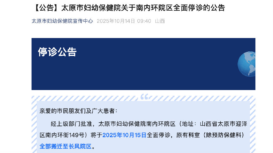 大型医院对规模扩张的热情渐冷。 01 合理控制大型医院规模 多地医院主动调整院区布局 10月15日,太原市妇幼保健院南内环院区全面停诊,原有科室全部搬迁至长风院区,地址为山西省太原市长风西街113号。同时,南内环院区预防保健科继续提供免疫规划、孕产妇健康管理、儿童健康管理等工作。 始建于1984年的太原市妇幼保健院,是一所集医疗、保健、科研、教学、康复、计划生育、健康管理七位一体的三级甲等妇幼保健院,设置床位1000张,可以算是华北地区体量最大的妇幼保健医院。 这一布局的调整被视为医院优化服务的主动实践;而院区功能整合也变得不再罕见。 10月16日,合肥市第三人民医院公告称,望江路院区启动整体升级改造工程,将暂停所有危重症急诊、住院、体检及其他非门诊类医疗服务,相关业务将统筹安排至其上海路院区开展;8月8日,四川省夹江县人民医院为集中提升妇女儿童医疗服务能力,将儿科、妇产科(门诊、住院部)整合到夹江县妇女儿童医院,原科室自8月16日起停止接诊;更早之前的6月,甘肃省白银市平川区人民医院宣布停诊,据称是为了进一步优化区域医疗资源布局。 早前,国务院办公厅已经印发《关于推动公立医院高质量发展的意见》提出,公立医院发展方式从规模扩张转向提质增效。 公立医院面临的运营压力,正成为推动这一转型的现实力量——中国医药企业管理协会发布的《2025年上半年医药工业经济运行情况》指出,在医保基金收支总体紧平衡、医保控费及基金监管加强的背景下,医院用药采购金额下降,医疗机构普遍面临资金压力,医药企业回款周期延长,一定程度上影响了药品销售增长。 床位资源利用率的下滑,进一步凸显了规模扩张模式的瓶颈。国家卫健委信息统计中心发布的《2024年1-11月全国医疗服务情况》显示,2024年1-11月,医院病床使用率为79.2%,同比减少1.0个百分点。 基于上述种种现实因素,以上海为例,2025年《上海市卫健委医政工作要点》就明确,加快医疗资源布局优化调整,公立医院分院区数量控制在3个以内。 2025年6月,国家卫生健康委印发《三级医院评审标准(2025年版)》要求,三级医院合理控制规模和落实功能定位,并设定了三级医院的总床位数、单体院区床位数、分院区数量等规模方面的指标和出院患者四级手术占比、病例组合指数(CMI)等体现医疗服务难度的指标,引导三级医院合理控制规模,更加聚焦于急危重症和疑难复杂疾病的诊疗服务。 在此导向下,已有公立医院主动对 “一院多区” 模式踩下刹车。 如山西省肿瘤医院南院区自8月1日起全面停诊,南院区现有全部科室搬迁至主院区,继续开展诊疗活动。与此同时,在医联体、医共体建设及分级诊疗政策的持续推进中,医院资源整合的路径更加多元。如广东德庆县中医院将住院业务集中至新院区,旧院区仅保留日间综合门诊服务,形成功能互补的服务格局。 02 民营医院生存进入压力测试期 除公立医院外,民营医院的发展同样是业内关注的重点。赛柏蓝观察发现,近年来,陆续出现了一些因经营亏损、医保违规等原因停诊或破产的民营医院,且其生存压力逐步向药企端传导。 近期,黄石锦欣妇产医院的处境具有一定的代表性,该院第一次债权人会议召开,目前债权情况为应收账款约192万元,系医保结算资金;同时对外负债总额约2262万元,其中包括80名员工工资合计345万元;更早前的3月,规划床位达2000张的大型民营医院鲁西南医院宣布破产,其负债规模已达12亿元,庞大的投入与持续亏损最终导致资金链断裂。