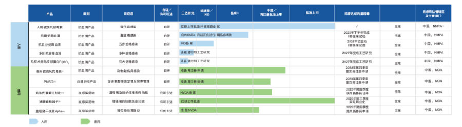 此外,其利用低风险、高效率的技术复用能力,形成了人用药和兽用药的协同产品组合,兽用管线包括兽用破伤风抗毒素、孕马血清促性腺激素(「PMSG」),以及若干用于补充或支持PMSG治疗的激素类药物;还引进了三款新兽药(兽用抗感染药物)管线的生产及商业化的权限,进一步丰富产品布局。这双飞轮模式下的产品管线面对的均是有明确市场缺口、且体量持续增长的市场。