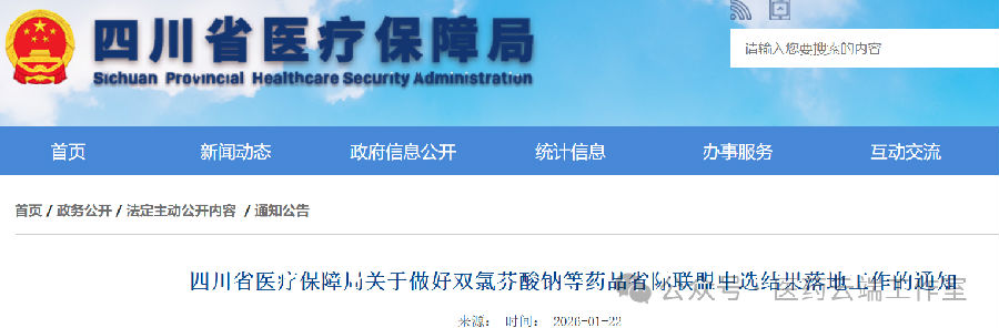 1月22日,四川省医保局发出《关于做好双氯芬酸钠等药品省际联盟中选结果落地工作的通知》,决定四川省将于2月6日起执行执行三大联盟集采中选结果。